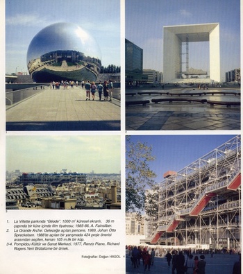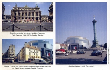 Paris, son zamanlarda uğradığı bütün dış kültürel baskılara karşın dilini, kültürünü, yapılarını yozlaşmaya karşı koruma savaşımı veriyor. Bu savaşıma karşın yine de bazı siperler yitirilebiliyor. Örneğin ünlü bazı Paris lokantalarıyla kafeleri yerlerini başka işlere, başka işyerlerine bırakabiliyor. Bastille Operası’nın yanıbaşında operanın yapımı sırasında, önce yıkılıp sonra tıpkı eskisi gibi inşa edilmiş olan ünlü Tour d’Argent Lokantası’nın yerini şimdi Fnac Kitabevi almış. Bu, kitaba olan saygımızla, çok da olumsuz bir gelişme sayılmayabilir; ancak değişimlerin tümü böyle olmuyor. Bastille’e gelmişken biraz da Bastille Operası’ndan söz edelim. Ana salonu 2700 kişilik olan bu opera binası, 1982 yılında 750 projenin katıldığı bir yarışma sonucunda birinci seçilen Uruguay asıllı Kanadalı mimar Carlos Ott’un tasarımına göre yapılmış ve Fransız ihtilalinin 200. yıldönümünde, 14 Temmuz 1989 günü çok görkemli bir törenle açılmıştı. Paris’in bu yeni ikinci opera binası hep birincisiyle, Haussmann zamanında yapılmış, çoğu kez mimarının adıyla anılan Garnier Operası’yla karşılaştırılmak talihsizliğine uğradı. O opera ki, II. Abdülhamid’e bile Fransa gezisinden sonra “saray gibi bir tiyatroydu” dedirtecekti (3). Parisliler, tarihsel bir bölge içinde yer alan, modernist sadeliğe sahip yeni opera binasını eski operaları kadar sevmediler, eskisini benimsedikleri kadar benimseyemediler. 400 milyon dolara mal olan binada şimdi önemli bir sorun var: cephedeki kaplama plakaları yerlerinden oynamış, düşmek üzere .. Bir kazayı önlemek için cephede, tehlikeli olabilecek bölümlere yer yer ağ geçirilmiş. Yine İhtilâl’in 200. yıl kutlamalarına yetiştirilmiş olan, “geleceğe açılan pencere” La Grande Arche binasında da cephe kaplamaları ve yangın güvenliğiyle ilgili sorunlar belirmiş. Şehrin başka noktalarında köşebaşlarındaki eski kaldırım kahvelerinin yerlerini Amerikanvari yaşamın temsilcileri hamburger lokantaları almış: McDonalds’ın karşısında Quick Burger boygösteriyor. Neyse ki bunların sayıları henüz çok değil ve yerleştikleri binaların eskisi gibi korunmasına gösterilen özen sürdürülmekte.