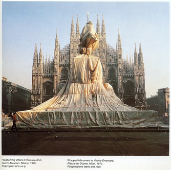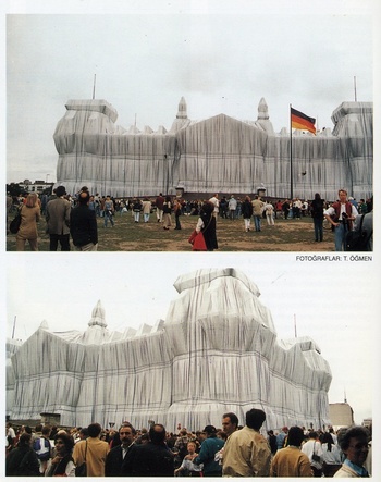 PAKETLENEN PARLAMENTO BİNASI Reichstag Binası, Christo’nun amaçladığı en önemli projelerden biriydi. 23 yıllık bir düşün gerçekleşmesi için gerekli, yaklaşık 8 milyon dolarlık finansman, tümüyle Christo’nun bu projeyle ilgili çizimlerinin, kolajlarının ve maketlerinin satış gelirlerinden sağlanacaktı. İşin teknik yönü ve lojistiği bütün ayrıntılarıyla düşünülmüştü. Sarma işlemine 17 Haziran’da başlanıp 23 Haziran’da bitirilecekti ve örtüyü taşıyacak, cephenin 1-2 m açığında kalacak çelik konstrüksiyon için 200 demir işçisi çalışacaktı. Kaplanacak örtü, uzun araştırmalardan sonra seçilmişti. Sert kıvrımlar yapabilecek türden seçilen örtü, alüminyum tozuyla gümüş rengine getirilmiş, uygulanmadan önce her türlü hava ve ışık koşulunda denenmiş, rüzgardaki titreşimleri bile incelenmişti. Sık sık değişen hava koşullarına ve şiddetli rüzgâra karşın sekiz günde bitirilen çalışmada örtü malzemesi olarak alüminyum tozu kaplı 75.000 m² polipropilen, 8.000 m mavi propilen halat ve 200 ton çelik kullanıldı. Sonuçta Berlin’deki eski Parlamento Binası sarılıp sarmalandı ve 25 Haziran-6 Temmuz arasında Berlinlilere ve Dünya kamuoyuna çok görkemli bir şekilde sunuldu. Bina bu kez, bir şelâleyi andırıyor ve içerisini tümüyle gizlemeyen yarı saydam görüntüsüyle yepyeni bir bütünlük oluşturuyordu. Medyada büyük bir ilgi, onbinlerce turist. Ve yıllarca anlatılacak bir olay … “Bu, sanat mıdır, değil midir?” sorusu tartışma konusudur. Bergson “sanat hayret değil, hayranlık uyandırmalıdır” der. Christo’nun yaptıkları hayranlıktan çok hayret uyandırıyor.