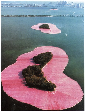 Çevrilmiş Adalar, Biscayne Koyu, Miami, Florida, 1983. 11 ada çevresinde 603.850 m2 yüzer örtü. Surrounded Islands, Biscayne Bay, Greater Miami, Florida, 1983. 503,850 square metres of fabric floating around 11 islands.