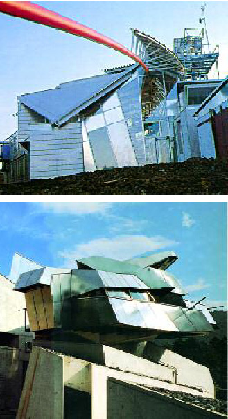 Öteki resimler ise dekonstrüktivist mimarlığın ünlü örneklerinden.. Üstteki Günter Behnish’in, Stuttgart Üniversitesi’ndeki Hyrolar Enstitüsü Binası (1987) ; alttaki, Mimar Günther Domenig’in, Avusturya’nın Graz şehrindeki kendi evi. Bu resimlerde, doğanın, yapıları rastlantısal olarak parçalayıp yarattığı biçimlerle, insan eliyle yaratılanlar arasında bir benzerlik görülmüyor mu? Zaten dekonstrüktivizm de bir anlamda, ayrışmış (dekompoze olmuş) bir konstrüktivizm olarak yorumlanmıyor mu? Bu anlayışa göre, dinamizm, değişkenlik, çelişkiler, sürprizler bütünü oluşturmuyor mu? Arkitektonik öğelerin parçalanması, ayrıştırılması; yataylık ya da düşeyliğin gerekliliği söz konusu değil mi? Dekonstrüktivist mimarlık düşüncesi; birbirinden farklı, ancak birbirini karşılıklı etkileyen, hattâ bozan, fakat birbirini yok etmeye çalışmayan biçimlerin birarada var olması şeklinde de tanımlanmıyor mu? İster doğal yoldan olsun, ister insan eliyle.. Sonuç ortada.. |