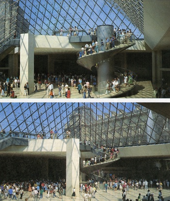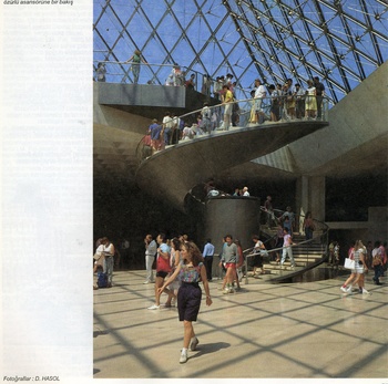 A.B.D. deki uygulamalarıyla * daha çok müzeler mimarı olarak bilinen Pei, projesinde giriş-çıkış düzenlemelerini avluda yerin altına alıyor, Louvre’un çeşitli bölümleriyle bağlantıyı bu merkezden sağlıyor; örtü olarak da bir büyük, üç küçük cam piramitten yararlanıyor.