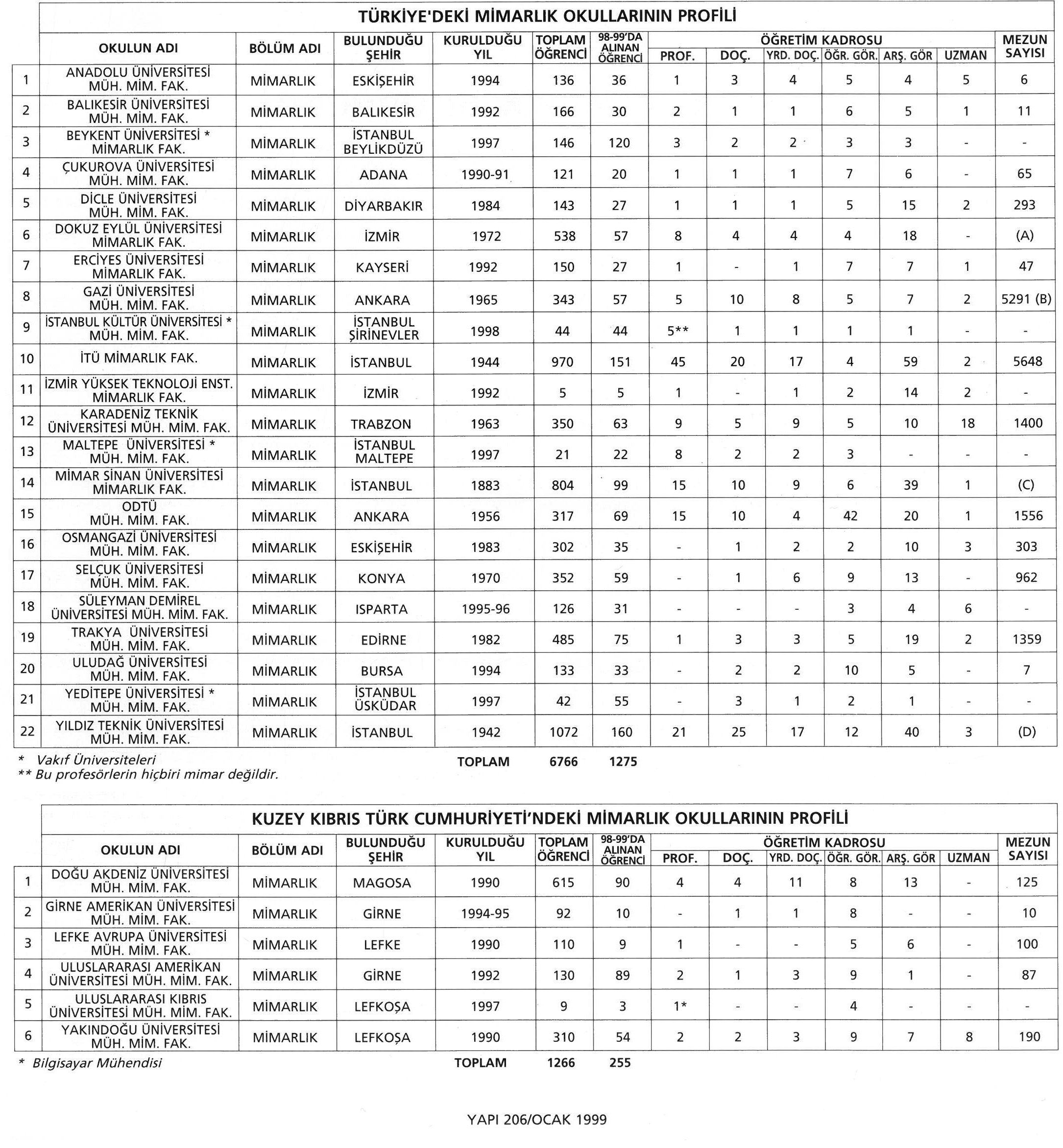 Şunu söylemekle yetinelim: işte mimarlık okullarının 1998 sonundaki manzarası. (1) D. Hasol, Mimarlık Eğitimi Aldatmacası ya da Hayali Mimarlık Eğitimi, YAPI 103, Haziran 1990 veya Bkz. Her Şeyin Mimarı Var S.90 YEM Yayın, 1998. ÇİZELGEYE İLİŞKİN AÇIKLAMALAR A. Dokuz Eylül Üniversitesi Mimarlık Fakültesi Mimarlık Bölümü’nün 1993 Ocak ayından bu yana mezun sayısı 613 olarak verilmiş olup, kuruluşundan Ocak’93 e kadar olan kesin mezun sayısı tespit edilememiştir. B. 1965 yılında Özel Yükseliş ve Özel Zafer Müh. Mim. Yüksek Okulu adlarıyla kurulmuş olan okullar 1972 yılında birleştirilerek Ankara Devlet Müh.Mim. Akademisi adını almıştır. 1982 yılında ise Gazi Üniversitesi Müh.Mim.Fakültesi adını alarak faaliyete geçmiş olup, kuruluşundan bu yana bildirilen Mimarlık Bölümü mezun sayısı (5291) yaklaşık rakamdır. C. Mimar Sinan Üniversitesi ilk kez 1883’te Sanayi-i Nefise Mektebi adı altında kurulmuş olup, Güzel Sanatlar Akademisi (GSA) ve Devlet Güzel Sanatlar Akademisi (DGSA) gibi isim aşamalarından sonra 1981’de Mimar Sinan Üniversitesi adını almıştır. Mimarlık Bölümü’ne ilişkin olarak bildirilen mezun sayısı 656 olup, bu sayı Mimar Sinan Üniversitesi dönemindeki Mimarlık Bölümü mezun sayısıdır. D. Yıldız Teknik Üniversitesi Mimarlık Fakültesi Mimarlık Bölümü 1997-1998 öğretim yılı mezun sayısı 183 olup, kuruluşundan bu yana toplam mezun sayısı tespit edilememiştir. |