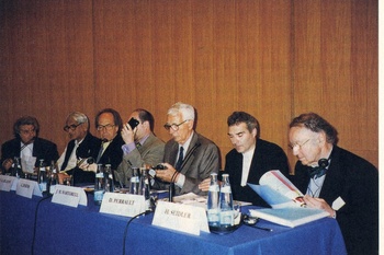 Açıkoturumda mimarlar; soldan: M. Botta, C. Correa T.G. De Leon, C. oykers, J.M. MartareII, O. Perrault, H. Seidler.
