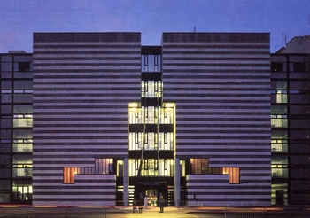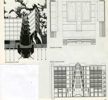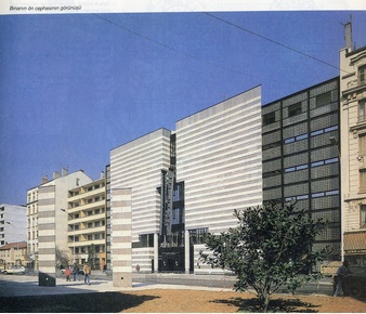 MİMARİ GÖRÜNÜM Mario Botta, yukarıda da belirtildiği gibi, yapıya çok belirgin bir işaret değeri kazandırmak istiyordu. Bu amaçla, E.Zola Caddesine açılan güney cephesinde anıtsal görünümlü, tam bir eksensel simetriye göre düzenlenmiş, karşıtlık içinde ikili planda bir cephe kuruluşu sergiler. Birinci planda, birbirine kenetlenmiş ardışık iki ayrı renkteki taş sıralarıyla oluşan çıkıntılı bölüm, ikinci planda ise, yanlarda, bir metal strüktür içinde cam tuğla panolar yer alır. Otoparka bakan kuzey cephesi ise mazgal delikleri şeklinde delinmiş bir dizi pencereyle ritimlenen yarım silindir biçiminde bir çıkma ile belirginleşir. Böylece Botta, taş cepheleriyle genelde dışa kapalı, gizemli bir bina yaratmıştır denebilir. Bina beyaz, gri ve siyahların nüanslarından, betonun, taşın, metalin ve camın doğal renklerinden oluşan bir bütündür. Bu renk düzeni mobilyada olduğu gibi çıplak beton kolonlara geçirilen gümüşü bileziklerde de kendini gösterir. Bilezikler bir bakıma cephedeki yatay bantların görsel olarak devamıdır. Binanın taş sıralarından oluşan birinci cephe düzlemi E. Zola Caddesine doğru taşmasıyla her iki yönden gelişte kolayca algılanmaktadır. Taş cephe iki yanda dar açılı köşelerle, cam tuğlalardan oluşan ikinci düzlemle birleşmektedir. |