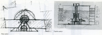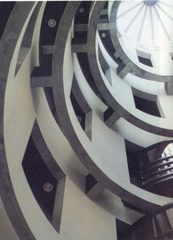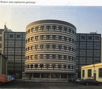 IŞIKKUYUSU Merkezi ışıklık çatıdan aşağıya doğru ters bir huni gibi genişleyerek hem gün ışığının binanın alt bölümlerine kadar rahatça süzülmesini hem de iç mekânda düşey ve yatay sürekliliği sağlıyor. Işık kuyusu birbiri üzerine konulmuş gibi görünen ve çapları her katta 1.20 m azalarak yukarıya doğru giden silindirlerden oluşur. Zeminde 8.00 m olan çap 5. katta 3.10 m. ye düşer. Toplam ağırlıkları 193 ton olan bu betonarme silindirler her katta ışınsal konsollarca taşınırlar, Bu konsollar da dairesel düzende yerleştirilmiş 50 cm çaplı yuvarlak kolonlara otururlar. Konsolların uzunluğu katlara göre 0.60 m ile 3.00 m arasında değişmektedir. Silindir parçaları dışarıda prefabrike olarak hazırlanmıştır. Birinci kattakiler ise 3.26 x 5.60 m lik, oldukça büyük boyutlarının getirdiği taşıma güçlüğü nedeniyle yine prefabrike olarak şantiyede dökülmüştür. Güçlük, bu büyük boyutlu eğri yüzeyli ve eğrilik yarıçapı her katta değişen elemanların tam bir silindir oluşturabilmeleri için büyük bir presizyonla hazırlanabilmelerindeydi. Ayrıca prefabrike öğeleri konsollara bağlayan çelik bağlantıların ve düğüm noktalarının da çok hassas bir şekilde etüt edilmesi ve uygulanması gerekmiştir.