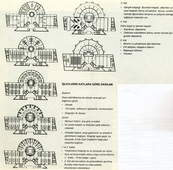 MEKÂN ÖRGÜTLENMESİ Mimari yarışma programında da belirtildiği gibi, bu projede iletişim kavramı çok önemliydi. Belge / okuyucu ilişkisini her belge tipine göre düşünmek, iç mekânları, ışığı, hareketleri ve dolaşımı bu amaçla düzenlemek gerekiyordu. Mario Botta bu ilişki gerekliliklerini ve serbest ulaşımı (açık sistemi) gözönünde tutarak işlevsel bir mekân örgütlenmesine gitmiş, binayı ileride olabilecek etkinlik türleri ile yeni gelişmelere de olanak sağlayacak şekilde esnek bir planlamayla 7 kat üzerinde düzenlemişti.