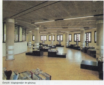 YAPININ İŞLEVSEL BÖLÜMLERİ Demokrasi ile kültürü birbirinin ayrılmaz parçası olarak gören Belediye’nin amacı, kentte yaşayanların ilgi alanlarını genişletmek, yeni anlatım tekniklerine yaklaşmalarını, yeniliklerin kaynağına inmelerini sağlamak ve böylece kültürel bir dinamizm yaratmaktı. Bu yapıyla, kitaplar, görüntüler ve seslerle herşeyden önce, çağın kültürel gerekliliklerine hizmet edecek bir merkez oluşturulması amaçlanıyordu. Lazerle basılmış kağıttan, sayısal görüntülere; kemandan sintisayzıra… Bugünün bütün anlatım araçları, bütün türleriyle, ilgilenenlerin ellerinin altındadır artık bu merkezde. Kitap, Görüntü ve Ses Evi’nin şimdilerde 25 bin üyesi var. Bu üyelerden 20 bininin aktif olduğu, yani sıkı bir ilişkiyi sürdürdüğü belirtiliyor. Bu merkez eski binasındayken 6 bini aktif olan 8 bin üyesi varmış. Binada 50 kişilik bir kadro haftada 45 saat boyunca üyelere sürekli hizmet sunuyor.